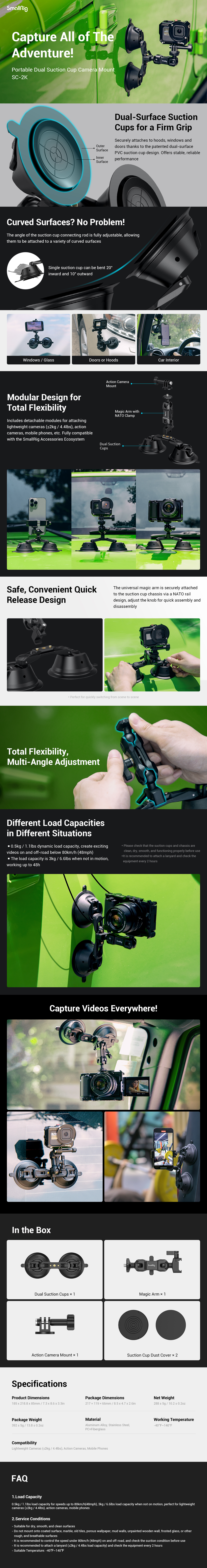 SmallRig Portable Dual Suction Cup Camera Mount SC-2K 3566 představuje lehké řešení pro fotografování akční kamerou a mobilním telefonem pomocí automobilu. Modulární konstrukce zahrnující dvě přísavky, univerzální magické rameno a držák akční kamery podporuje většinu lehkých fotoaparátů (např. Sony ZV-1, Canon řady G7X atd.), akčních kamer a mobilních telefonů na trhu. Držák kamery se dvěma přísavkami je navržen pro rychlou demontáž jediným stisknutím tlačítka; Exkluzivní patentovaná dvouvrstvá konstrukce přísavek navíc umožňuje bezpečné, dlouhotrvající a stabilní podpůrné natáčení; v místě, kde jsou přísavky k sobě připevněny, je prostor nastavitelný v úhlu 20°, což umožňuje jejich připevnění na zakřivené povrchy. Univerzální kouzelné rameno se na jednom konci připevňuje ke dvěma přísavkám pomocí lišty NATO a rychle se montuje na další příslušenství na lištu NATO a šroub 1/4"-20 na druhém konci slouží k připojení fotoaparátů, mobilních telefonů, akčních kamer a dalších zařízení. Nástavec pro akční kamery obsahuje univerzální držák GoPro a zajišťovací šroub, který podporuje magické rameno pro akční kamery. Kromě toho je součástí balení speciální kryt proti prachu s přísavkou, který zabraňuje usazování prachu, a prodlužuje tak jeho životnost.