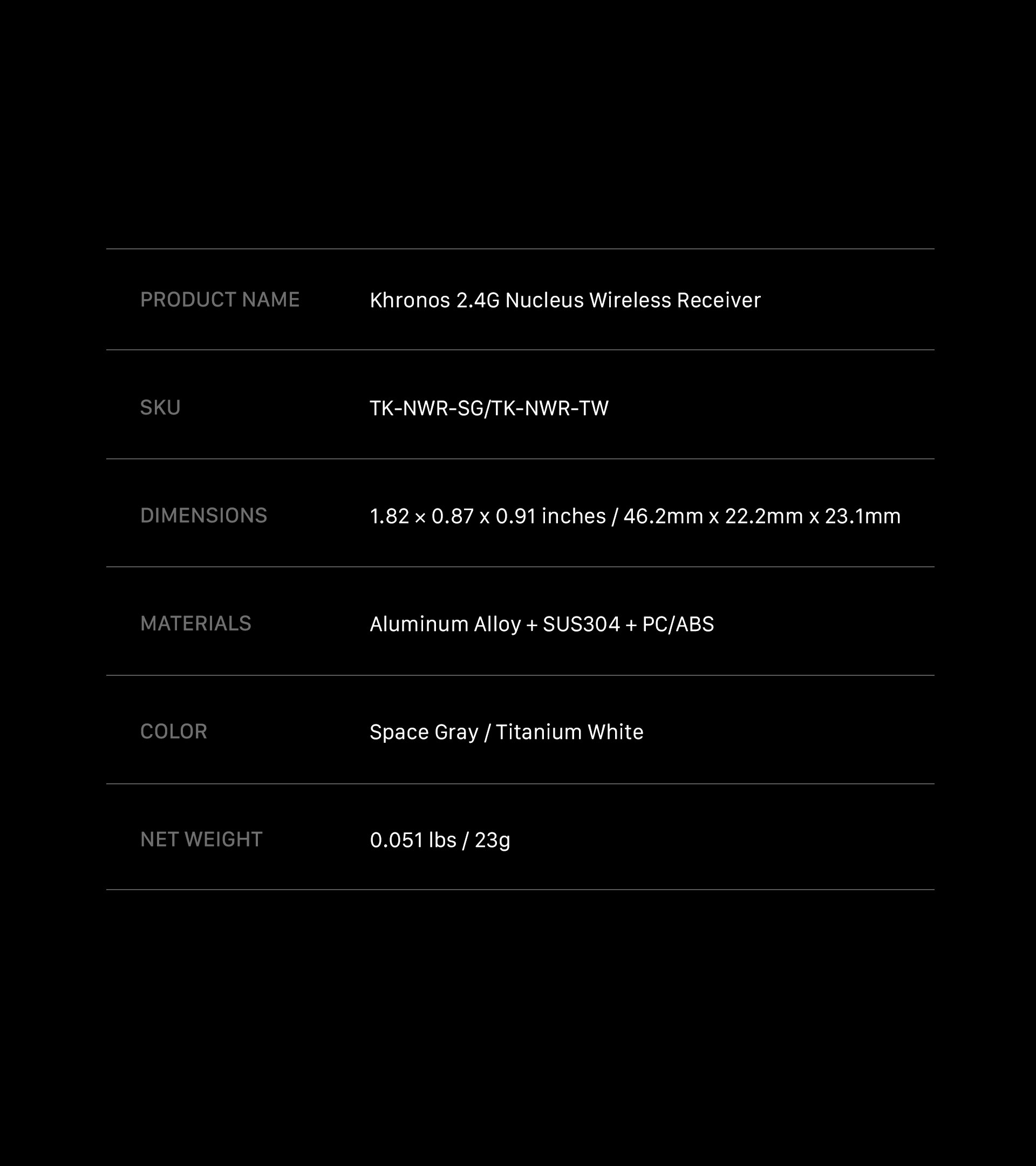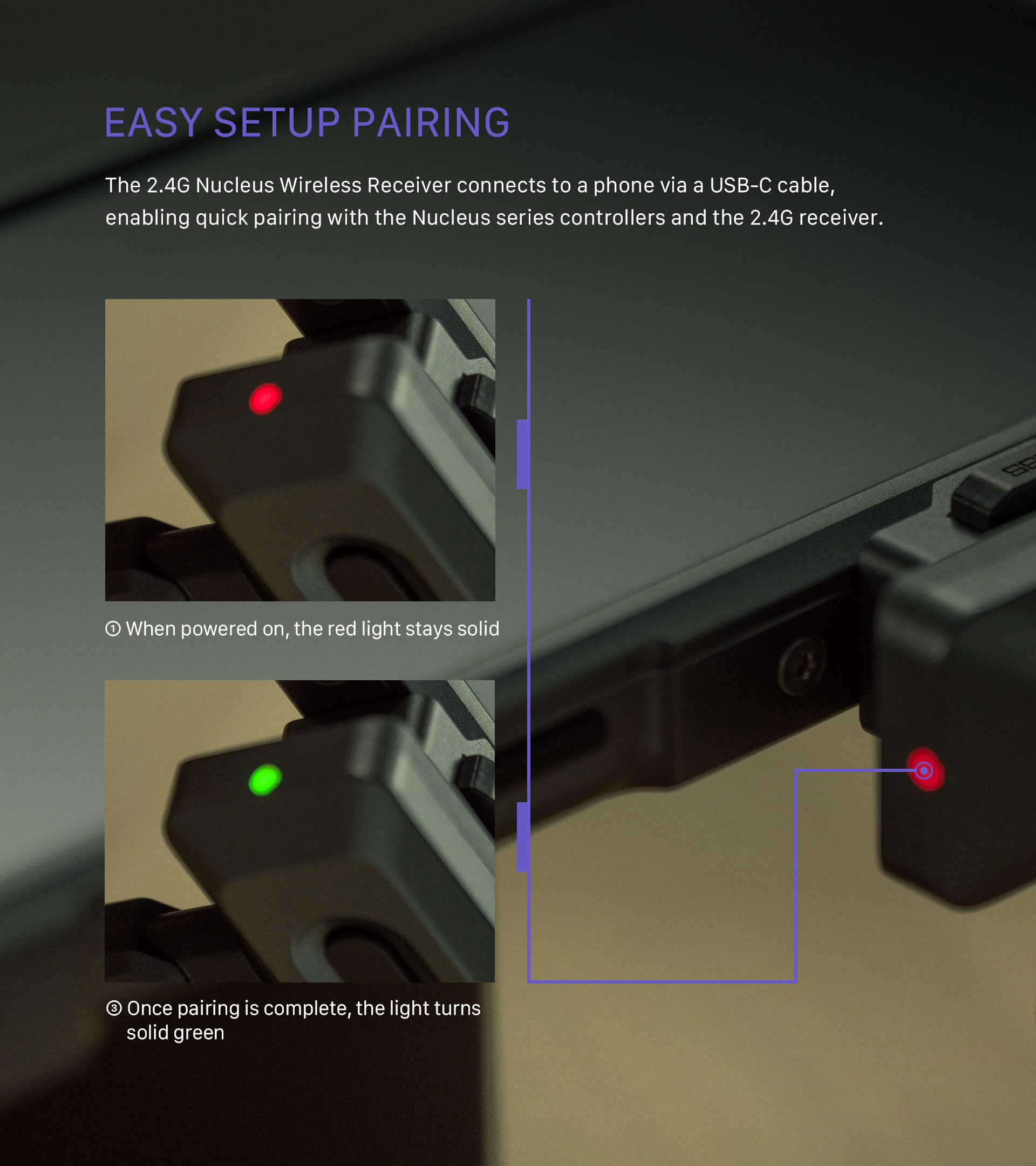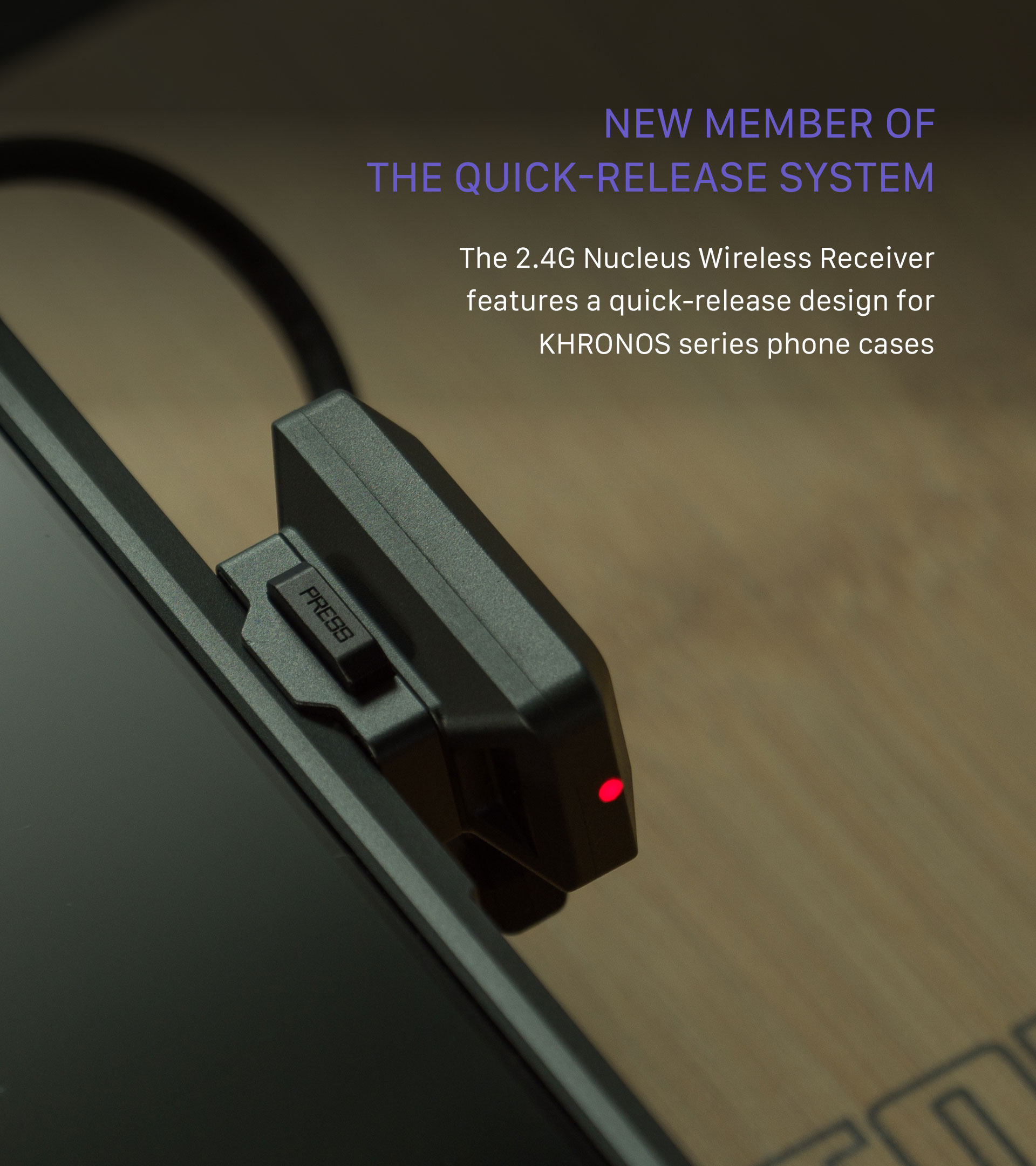 Představujeme bezdrátový přijímač Khronos 2.4G Nucleus. Toto příslušenství se upevňuje pomocí rychlospojky, kterou najdete na našem pouzdře Khronos pro iPhone, a připojuje se k iPhonu 15 Pro a Pro Max pomocí přiloženého kabelu USB-C.