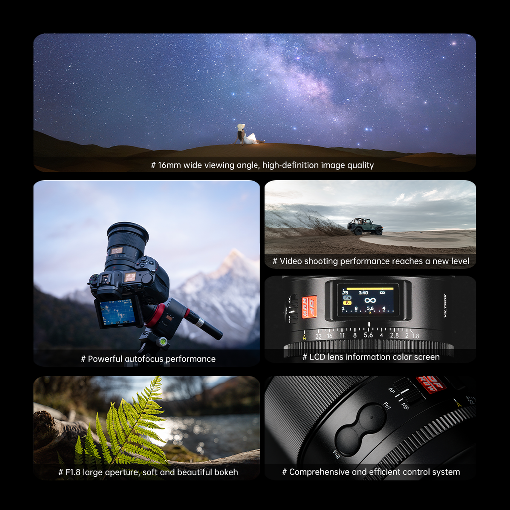 AF 16 mm F1,8 Z má jedinečné výhody pro krajinářskou/astrofotografickou fotografii, plnoformátové snímky s vysokým rozlišením a vysokou kvalitou. tři asférické čočky pro přesnou reprodukci bodových zdrojů světla a účinné potlačení komy.